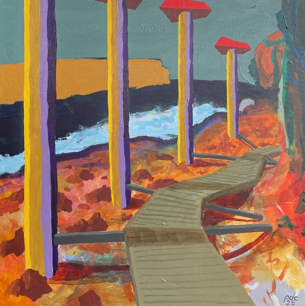 From my perspective, there is a likewise fraught psychological dimension to this painting given its raw forms and strong colour. Of note is the complimentary use of yellow and violet in the columns, the reds chromatically energising the teals, ochres, siennas, and umbers of the landscape, and the block-like headland and sea foam contrasted with a serpentine pathway (or is it an ominous shadow?). I immediately thought of the Sea Cliff Bridge at the Illawarra escarpment, though if this is a reference it has been imagined as an unfinished monolith, absent of its soaring span sections.
